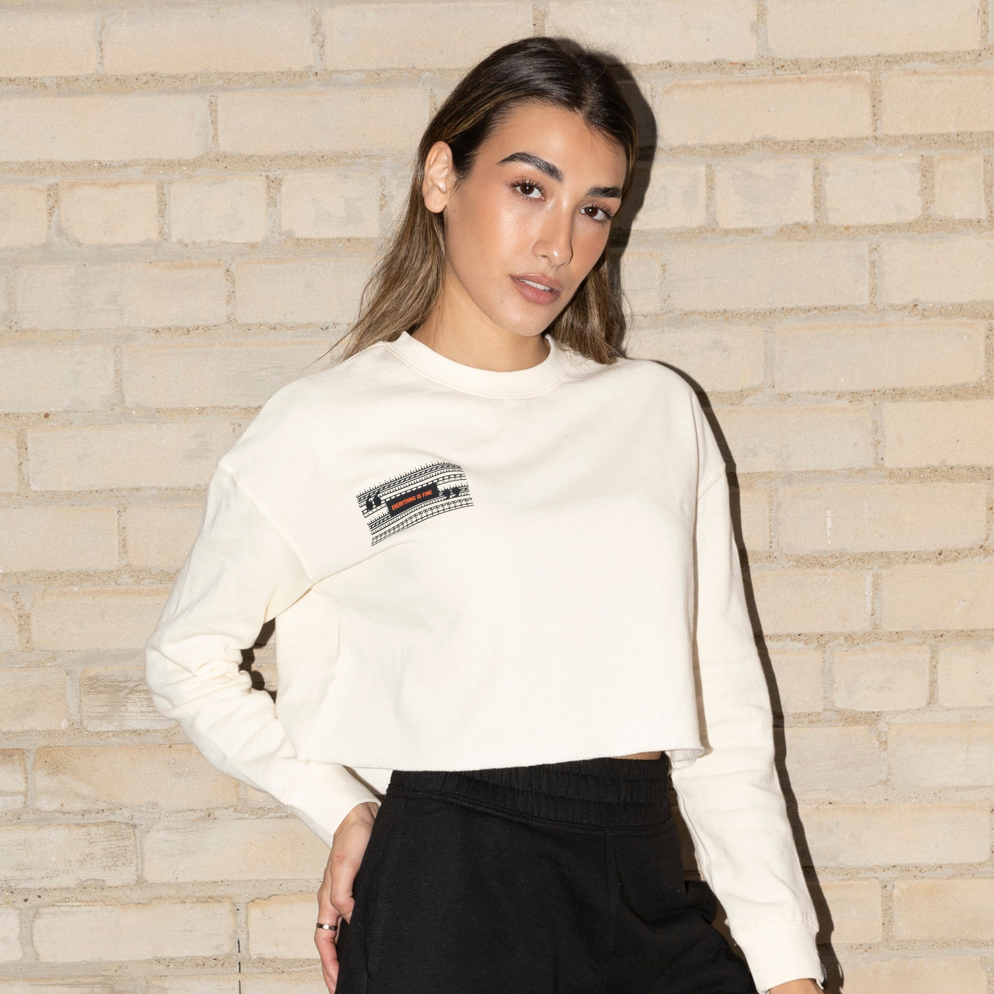 A cropped crew that keeps it simple - until you scan it. Lightweight fleece with a raw-edge hem and a relaxed fit: soft enough for movement, structured enough to hold its shape. A small QR code label on the sleeve unlocks a hidden AR affirmation, turning a basic layer into something personal.