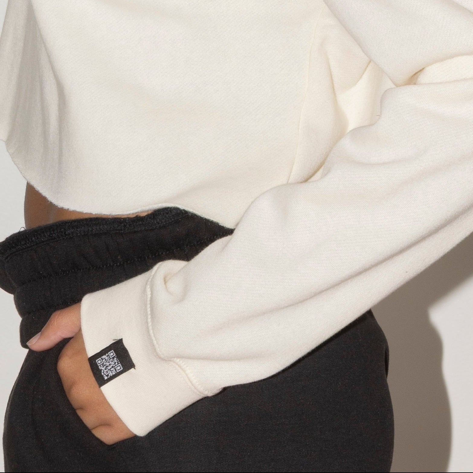 A cropped crew that keeps it simple - until you scan it. Lightweight fleece with a raw-edge hem and a relaxed fit: soft enough for movement, structured enough to hold its shape. A small QR code label on the sleeve unlocks a hidden AR affirmation, turning a basic layer into something personal.